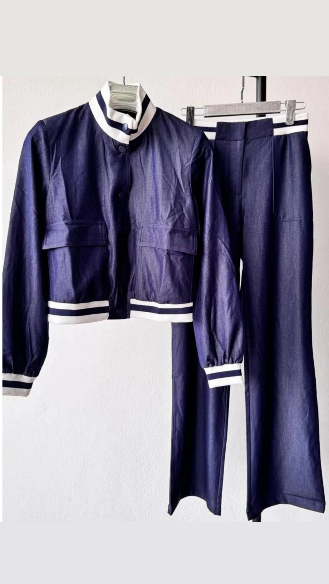 Set tela simula mezclilla strech con detalle deportivo en resorte en cintura, puños, cuello